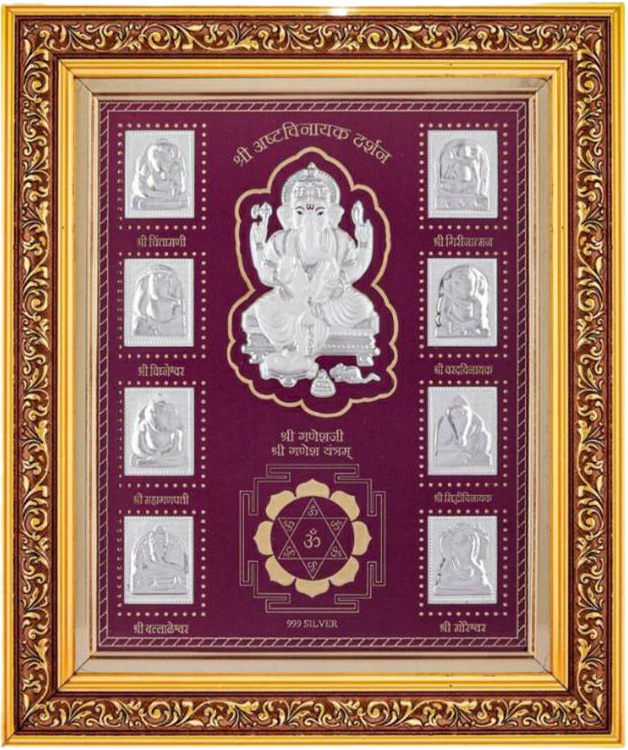 This large-size frame (11 x 13.25 inches) is crafted in a square-style layout, featuring 999 pure embossed silver artwork of Ashta Ganapathi. The photo is enclosed in a premium wooden frame, and comes in attractive gift box packaging, ready for spiritual and festive gifting.