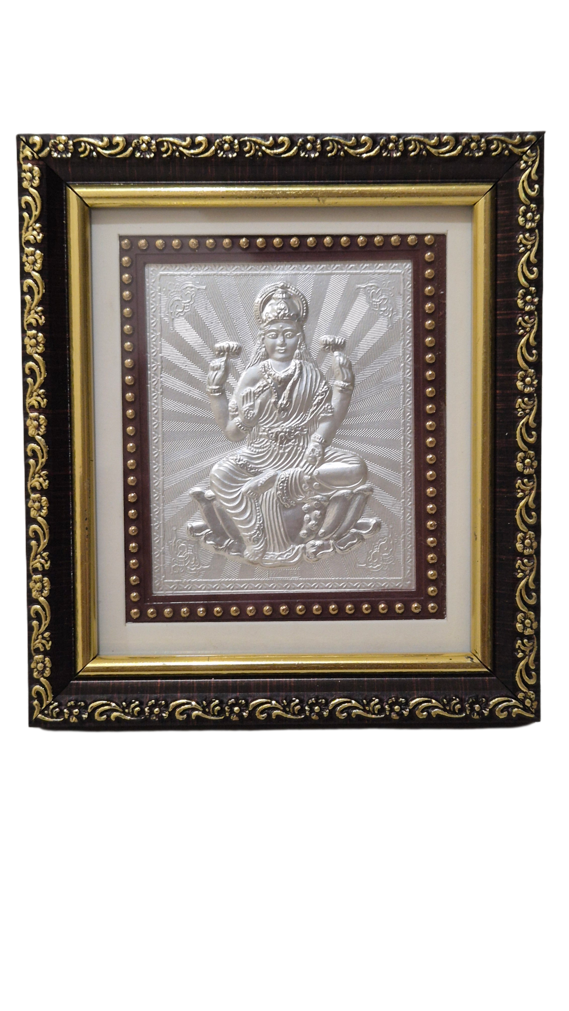 Invite the blessings of Goddess Laxmi with this embossed 999 pure silver photo, elegantly placed in a wooden-style frame. The compact 5×5.5 inch size makes it ideal for home temples, workspaces, or festive gifts.